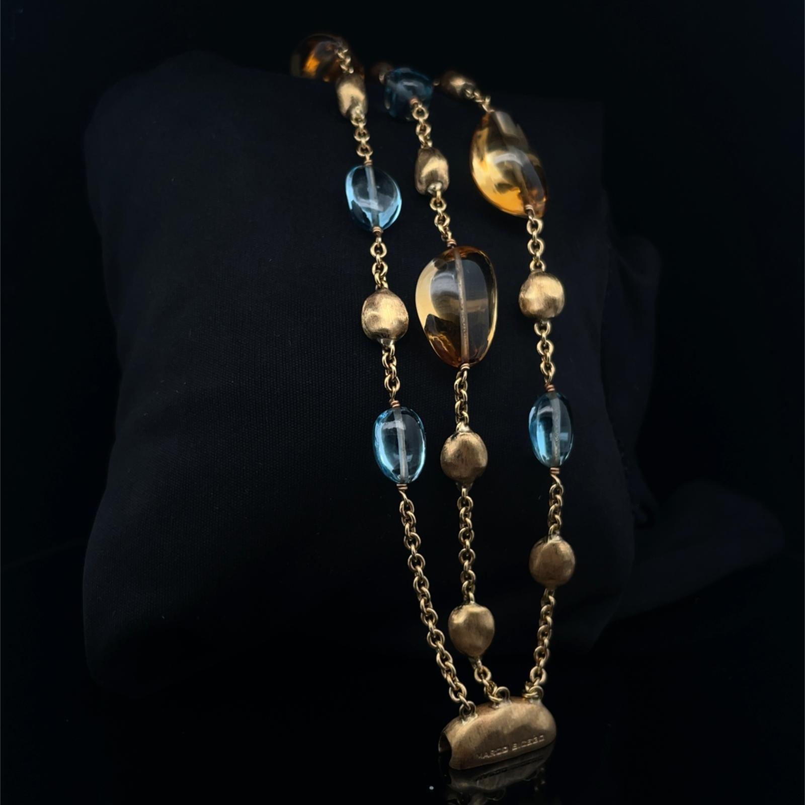 This Marco Bicego bracelet harmoniously blends warm gold with vivid gemstone fire crafted in 18kt gold.
