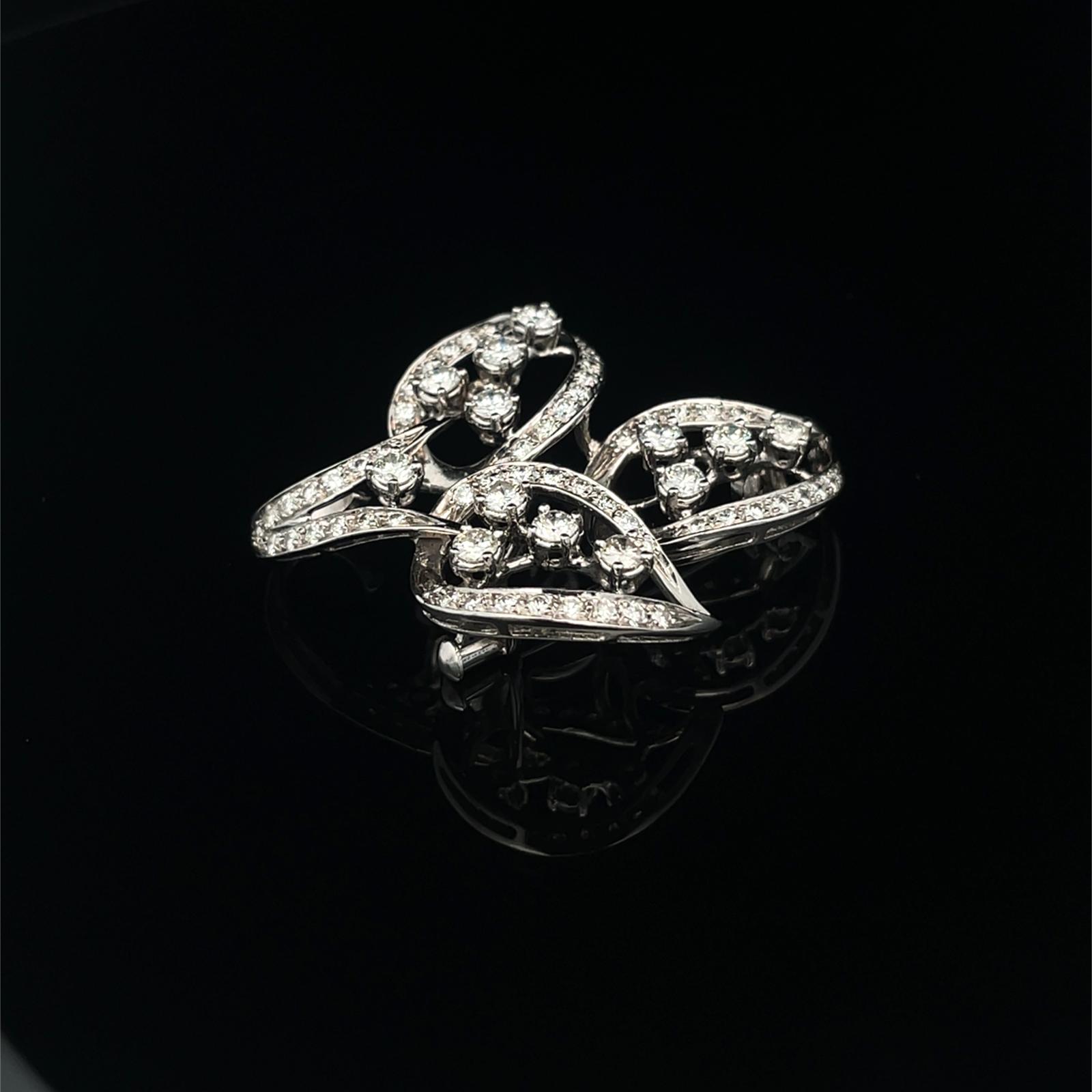 The brooch contains 13 stones of 0.10ct each, 46 stones of 0.03ct each and 13 stones of 0.015ct each, F/G colour and VVS/VS clarity.