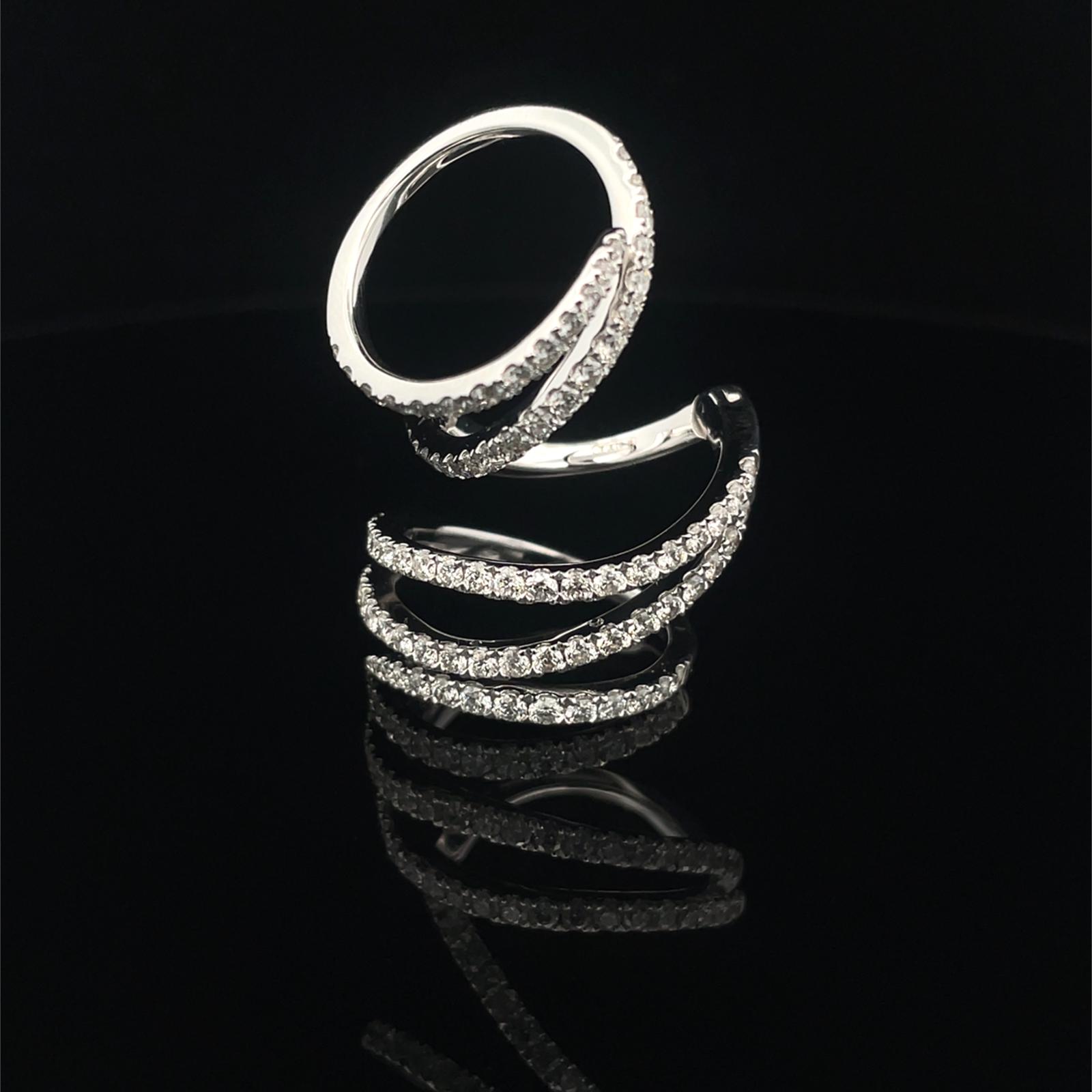 A striking expression of refined luxury, this Crivelli ring is expertly crafted in 18kt white gold and adorned with 83 round brilliant cut diamonds of 1.75ct total. The overall weight of this statement piece is 12.40 grams.