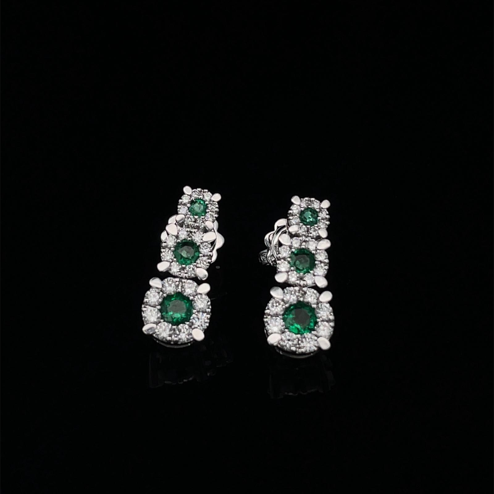 One pair of dress earrings crafted in 18kt white gold showcasing six round cut emeralds of 0.74ct total, and multiple round brilliant cut diamonds of 0.74ct total. The overall weight of the earrings is 5.60 grams.