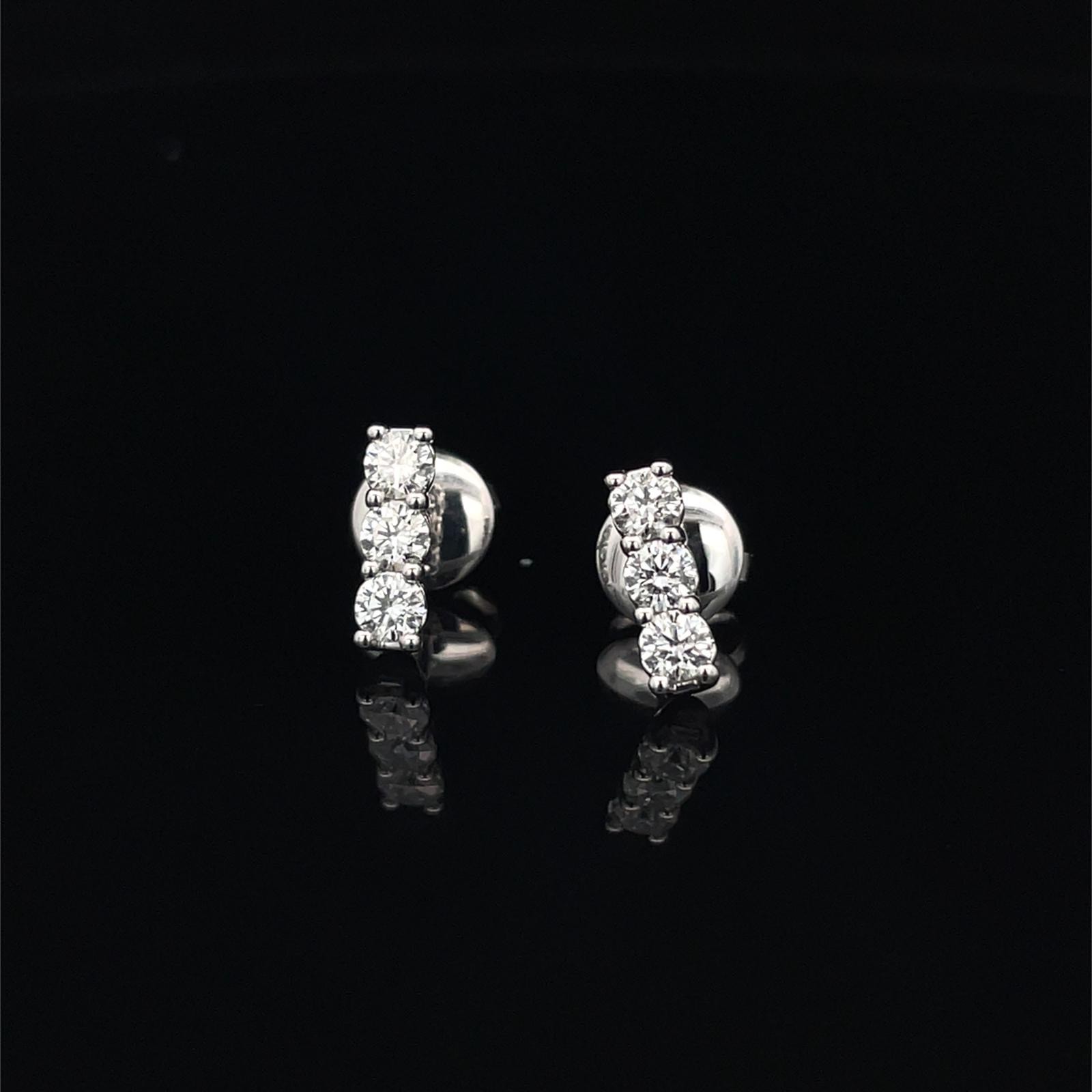 One pair of trilogy stud earrings crafted in 18kt white gold showcasing six round brilliant cut diamonds of 0.60ct total. The overall weight of the earrings is 2.30 grams.