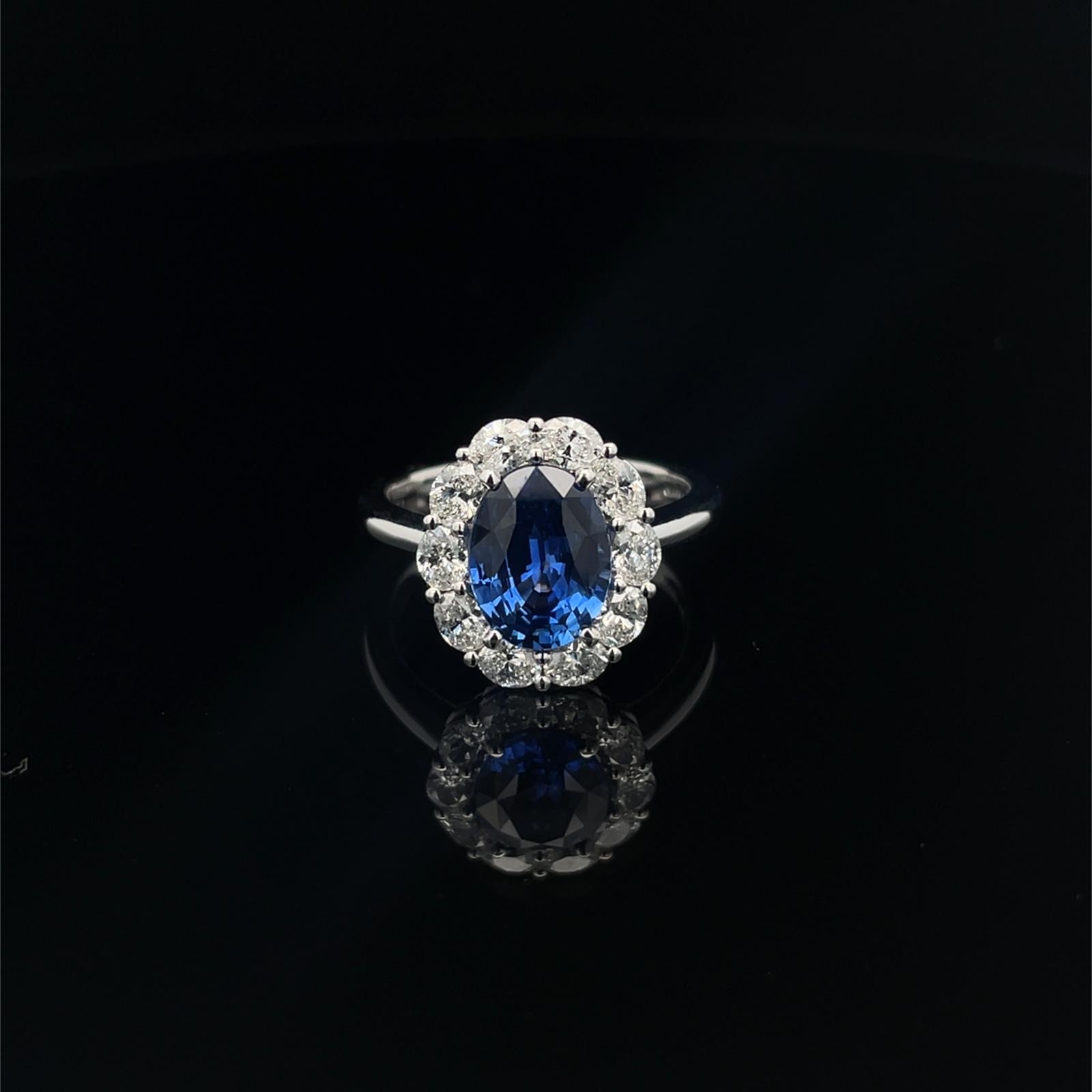 One cluster ring crafted in 18kt white gold shocasing one sapphire of 2.52ct and multiple round brilliant cut diamonds of 0.92ct total. The overall weight of the ring is 5 grams.