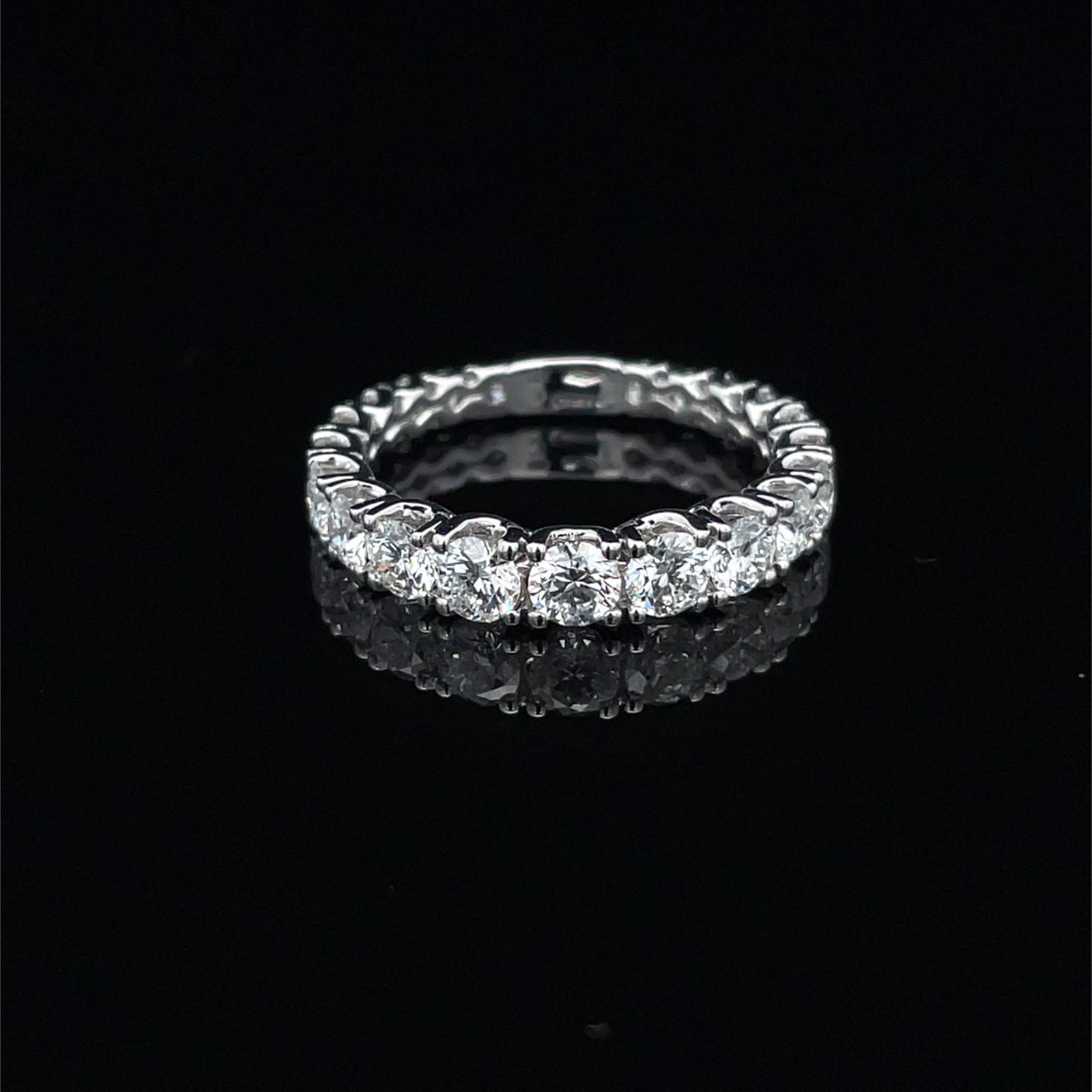 One ring crafted in 18kt white gold showcasing 21 round brilliant cut diamonds of 2ct total. The overall weight of the ring is 2.40 grams.