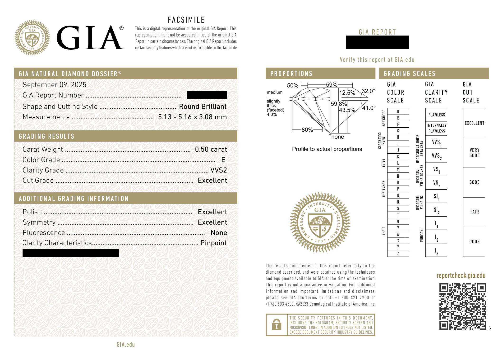 One round brilliant cut diamond of 0.50ct, E colour, VVS2 clarity, excellent cut, polish and simmetry, none fluorescence. GIA certified.