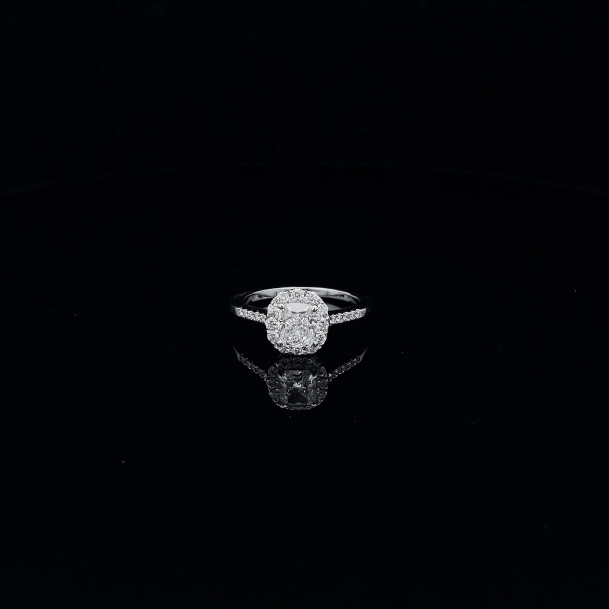 One halo diamond ring crafted in 18kt white gold showcasing one cushion-cut diamond of 1.01ct, E colour, VS2 clarity, and multiple round brilliant cut diamonds of 0.28ct total. The overall weight of the ring is 3.56 grams.
