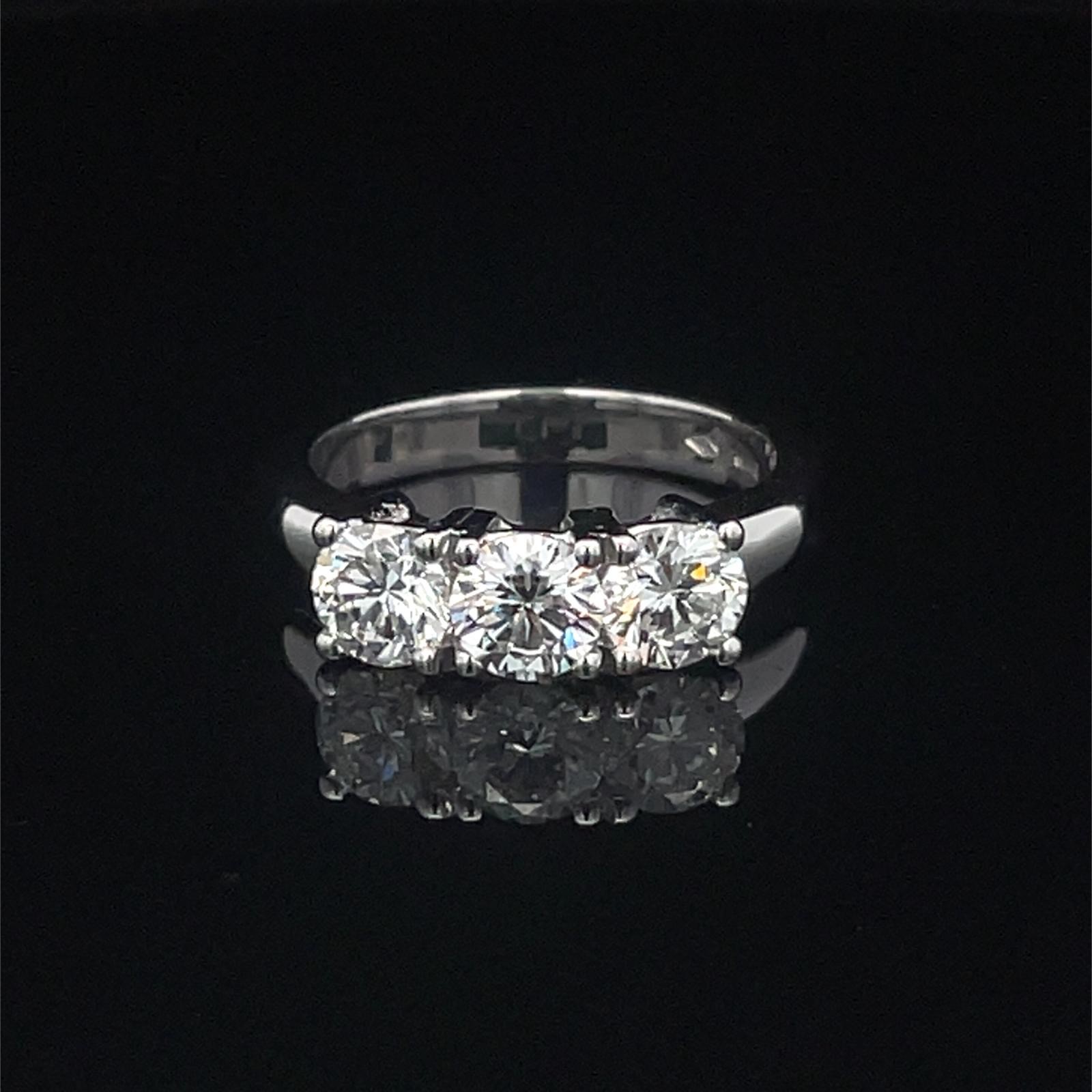 One trilogy ring crafted in 18kt white gold showcasing 3 round brilliant cut diamonds of 1.50ct total, F colour, VVS2 clarity.