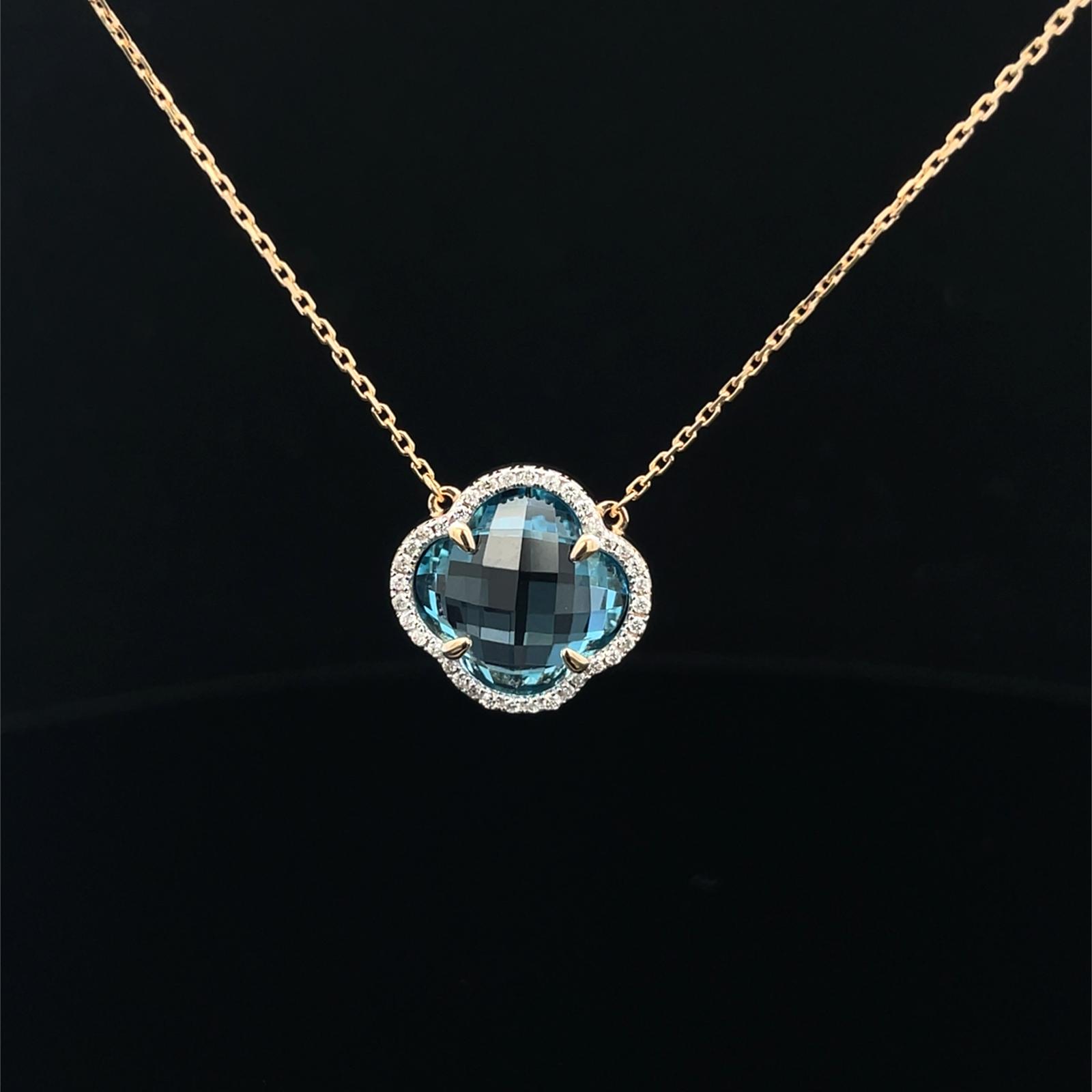 One necklace crafted in 18kt yellow gold showcasing one swiss blue topaz of 5.07ct and multiple diamonds of 0.13ct total. The overall weight of the necklace is 2.85 grams.